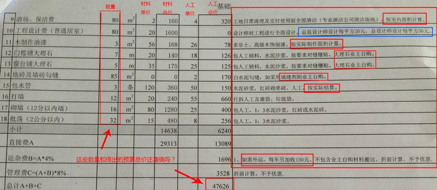 第二,備注里有很多價錢說明。最后業(yè)主的結(jié)算會高于預算總價。